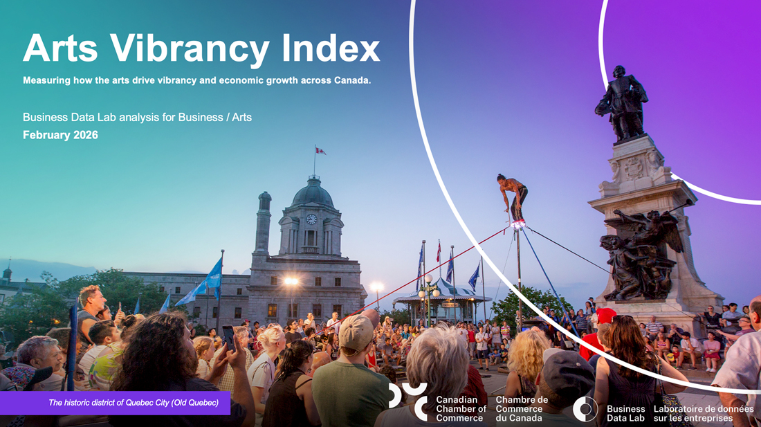 The Art Vibrancy Index follows the release of the report Artworks: The Economic and Social Dividends from Canada’s Arts and Culture Sector. This research is conducted by the Canadian Chamber of Commerce’s Business Data Lab and commissioned by Business / Arts in partnership with Canada Council for the Arts.
